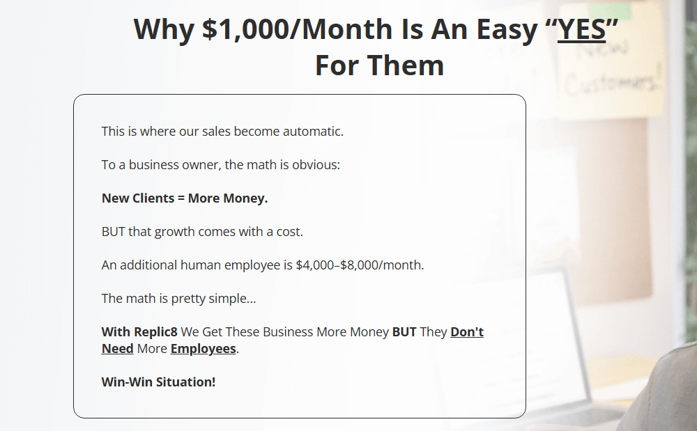 And the monthly pricing logic is expressed in a fashion that even business-owners can understand. Recruiting and managing a team is an expensive, unpredictable thing, whereas Replic8 slots in as a reliable, on-call fix. From the customer standpoint, this also makes it an easier conversation, because you’re talking about operational costs, opportunity cost, and consistency instead of just trying to talk their ear off about benefits. Now that’s not to say every business is a fit—some don’t have the volume of leads, others can’t convert effectively—but the conversation was grounded in real operational pain points rather than hype.